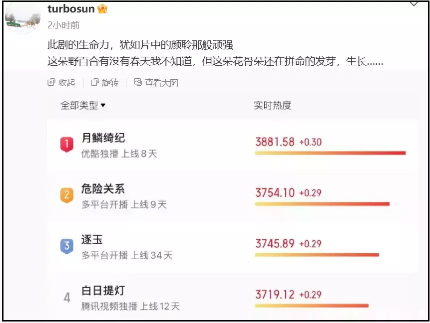 这时候回头看孙俪收官动态文案中提及的“顽强”、“有没有春天”、“拼命的发芽,生长”,隐隐约约感受到孙俪为新剧热度抱不平,结合配图,不止一位网友认为孙俪是在催数据。